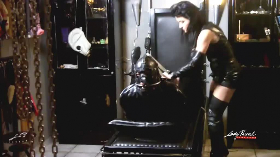 In this part, I like a very restrictive prone position in a straitjacket. My victim gets over his regular mask a bondage harness, which I connect later with his rear legs drawn up. If he drops his head forward, he pulls his legs tighter ... In addition, he receives a rigid steel harness around his ankles, so that here is really no movement possible. That's a very beautiful defenseless ...